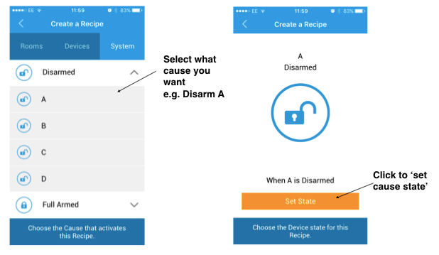 Then select what ‘cause’ you want to make, out of the list of system, devices and rooms. For example, choose ‘open front door contact contact’ (meaning when the front door contact opens it ‘causes’ something to happen ).