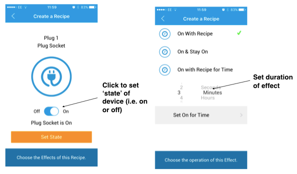 Once you’ve chosen your plug socket, you then need to select the ‘state of the plug (i.e. on / off), and if you select ‘on’ you then need to select a ‘duration’ of the effect.